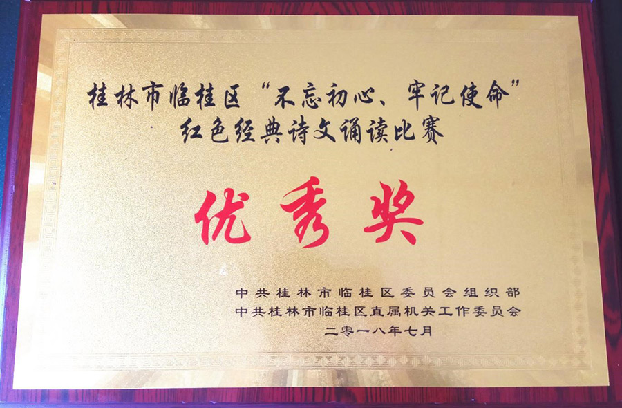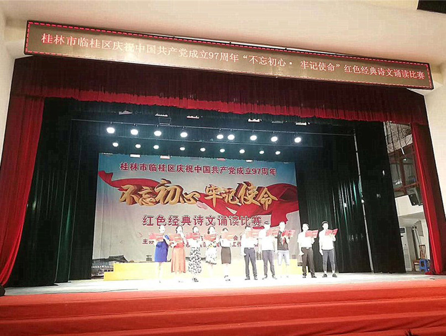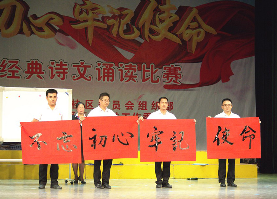 活動中,選手們通過朗誦紅色經(jīng)典詩詞,深情回顧黨的光輝歷程、謳歌黨的豐功偉績,真誠地表達了對黨、對祖國的擁護與熱愛之情。參賽選手們儀態(tài)莊重大方,朗誦聲情并茂,以配樂、舞蹈、書法展示等多種形式,或深情款款、或激情高昂,用飽滿的熱情將紅色經(jīng)典的內涵精彩地展現(xiàn)在觀眾面前,充分展示了臨桂區(qū)廣大黨員干部的良好精神風貌。新城投資集團黨支部四名黨員聲情并茂地共誦《不忘初心,牢記使命,我們永遠在路上》,節(jié)目形式新穎,選手感情充沛,朗讀完詩歌后,黨員譚佳璐現(xiàn)場飽含情感的用毛筆書寫了“不忘初心,牢記使命”八個大字,表達了黨員們樹立遠大的理想、力爭上游、為祖國的強盛貢獻力量的決心。與其說這是紅色經(jīng)典詩文誦讀,不如說這是一次視聽盛宴,更是黨員們愛黨愛國的精彩演繹。