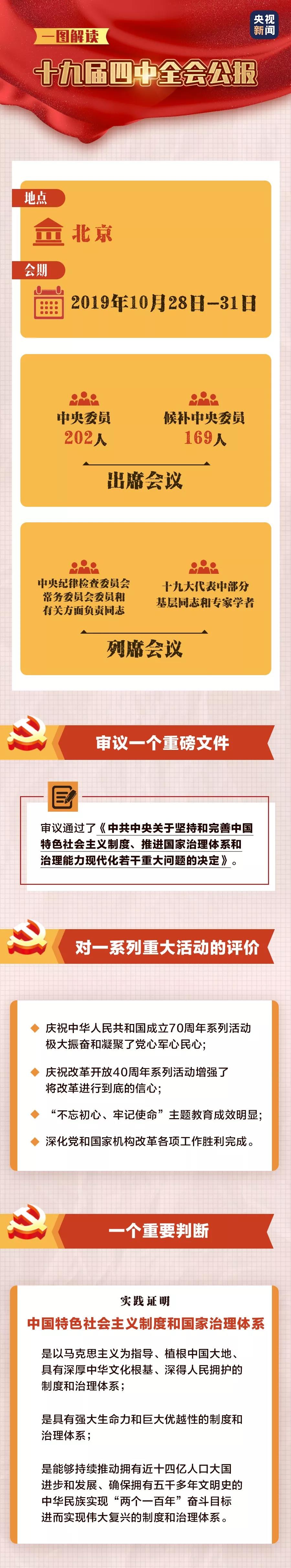 黨的十九屆四中全會在北京勝利閉幕,這是在慶祝新中國成立70周年的重要節(jié)點,向全面建成小康社會、實現(xiàn)第一個百年奮斗目標(biāo)邁進(jìn)的關(guān)鍵之年召開的一次重要會議,充分肯定我們黨治理國家取得的歷史性成就,全面總結(jié)我國國家制度和國家治理體系的顯著優(yōu)勢,明確了加強和完善國家治理必須堅持的基本原則以及總體目標(biāo)、工作要求,為堅定制度自信、實現(xiàn)偉大夢想提供了根本遵循,指明了正確方向。
