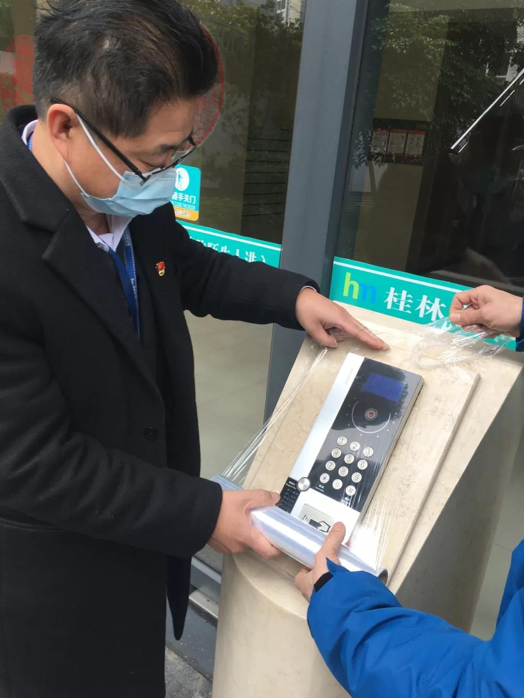 工程部在其部門負責人、共產黨員周成同志的帶領下,全員提前返崗。通過給小區(qū)所有入戶門對講系統(tǒng)及電梯內按鍵穿上每天一換的保鮮膜“保護外套”、給每臺電梯內裝上業(yè)主按鍵時使用的抽紙等方法,最大程度減少接觸病菌細菌的幾率,不留隱患,給業(yè)主創(chuàng)造一個健康、 安心的居家環(huán)境,為所有業(yè)主守住這道防疫防線。