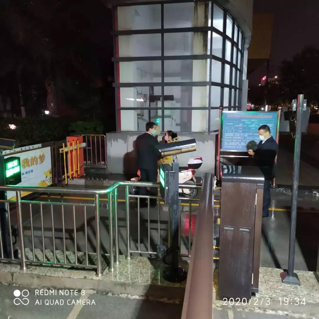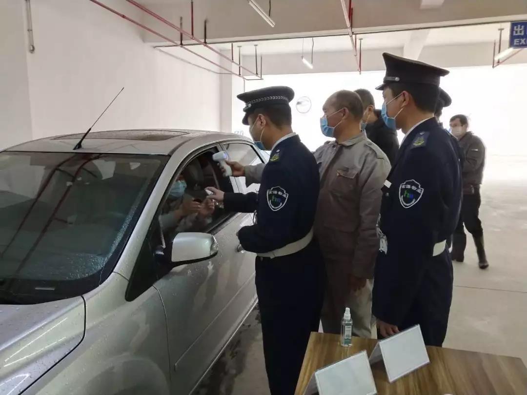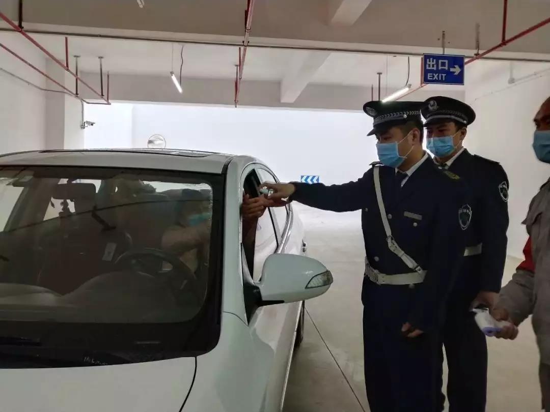 ▲地下停車場也設(shè)立了疫情防控崗,為進入停車場停車人員測體溫、噴灑酒精消毒。