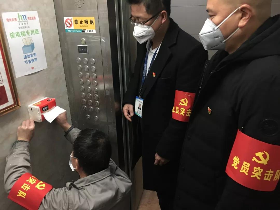 ▲黨員突擊隊正在更換小區(qū)對講系統(tǒng)、電梯按鍵防菌用塑料膜和按電梯專用紙。