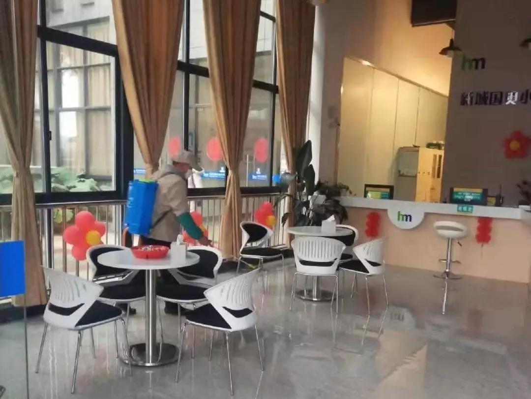 ▲保潔人員分別對物業(yè)中心、員工食堂、小區(qū)門崗、宏謀體育館等區(qū)位進行全面消毒。