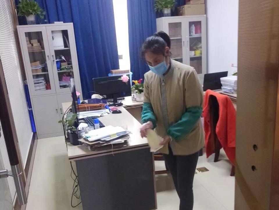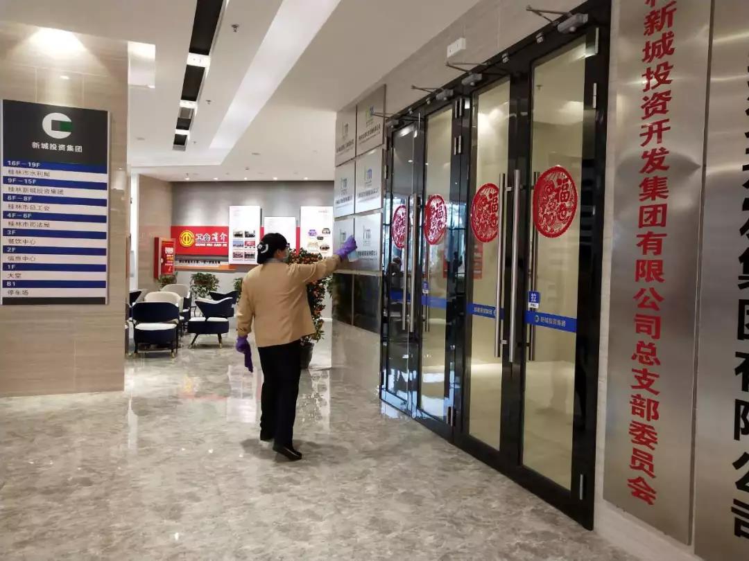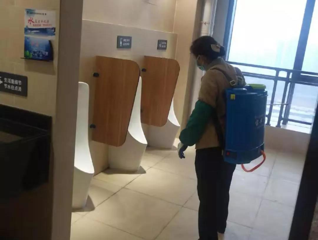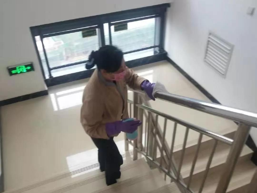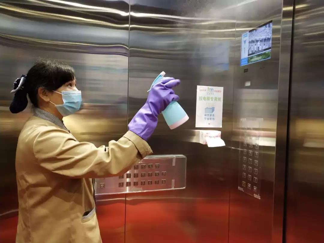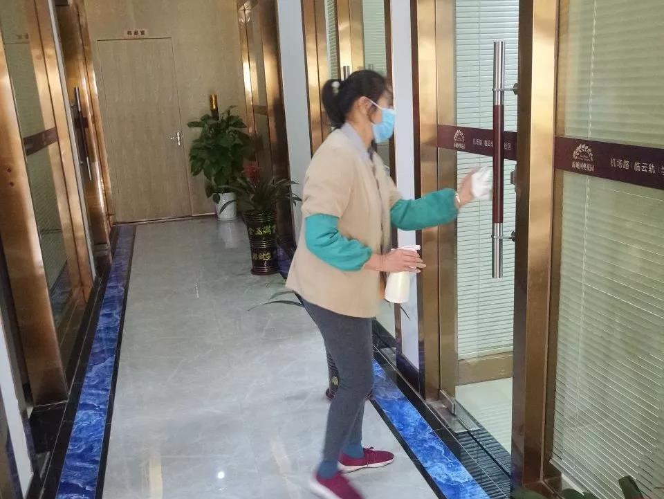 ▲保潔人員在對電梯、出入門廳、辦公區(qū)域、樓梯間、衛(wèi)生間等地進行全面消毒。