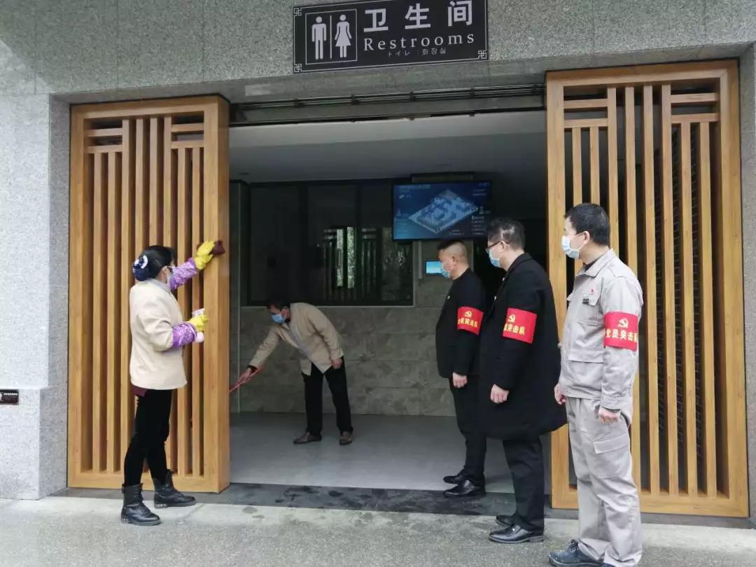 ▲黨員突擊隊成員趙劍波、周成組織相關(guān)人員對景區(qū)的防疫工作及安全工作進行檢查。