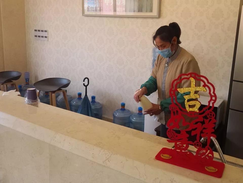 ▲保潔人員在對各門把手、茶水吧臺、辦公區(qū)域全面消毒。