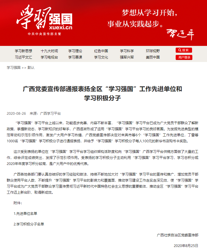 附:《廣西黨委宣傳部通報表揚全區(qū)“學(xué)習(xí)強國”工作先進(jìn)單位和學(xué)習(xí)積極分子》