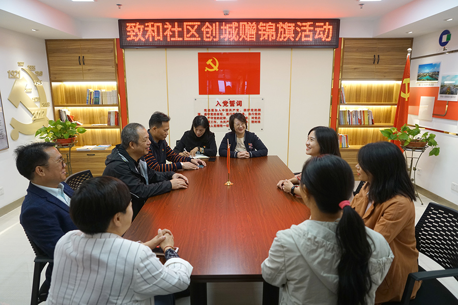 10月14日上午,臨桂區(qū)致和社區(qū)書記張妮妮一行三人將一面印有“黨旗映勝地 創(chuàng)城我先行”的錦旗交至新城投資集團(tuán)黨總支書記、董事長、總經(jīng)理周道林手中,感謝新城投資集團(tuán)急群眾所急,想群眾所想,舉全力為社區(qū)、為群眾解難題、辦難事。