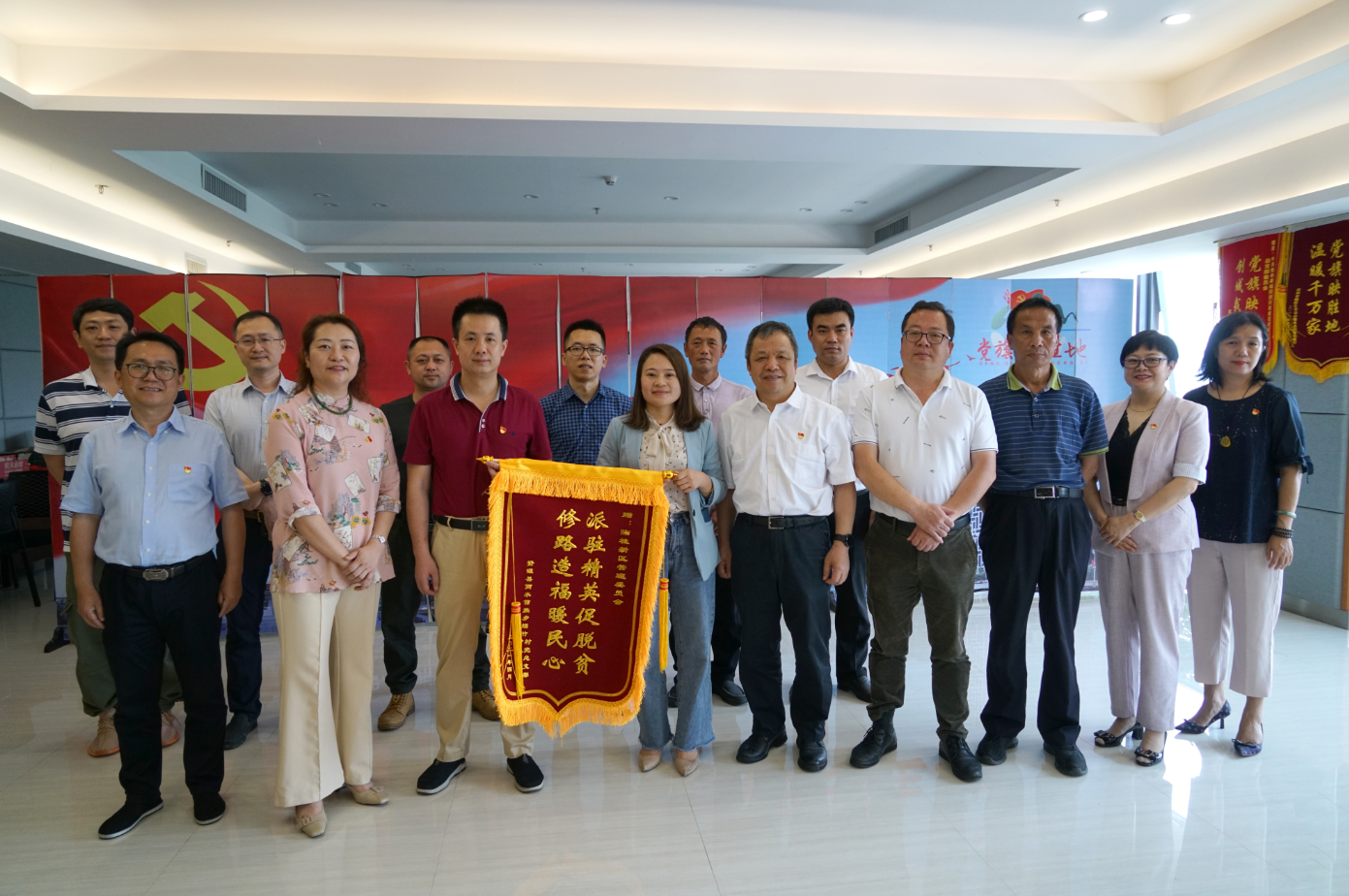 5月11日,資源縣兩水苗族鄉(xiāng)副鄉(xiāng)長曾祥超,煙竹村黨總支書記、村委主任龍小玉等一行將“修路造福暖民心,派駐精英促脫貧”的錦旗送到桂林新城投資集團辦公大樓,對駐村隊員及后盾單位兩年來對煙竹村的幫扶工作表示感謝。臨桂新區(qū)工委委員、管委會副主任、新區(qū)機關(guān)黨委副書記文杰,新區(qū)工委組織人事部部長梁利,新城投資集團黨總支書記、董事長、總經(jīng)理周道林出席贈錦旗活動。