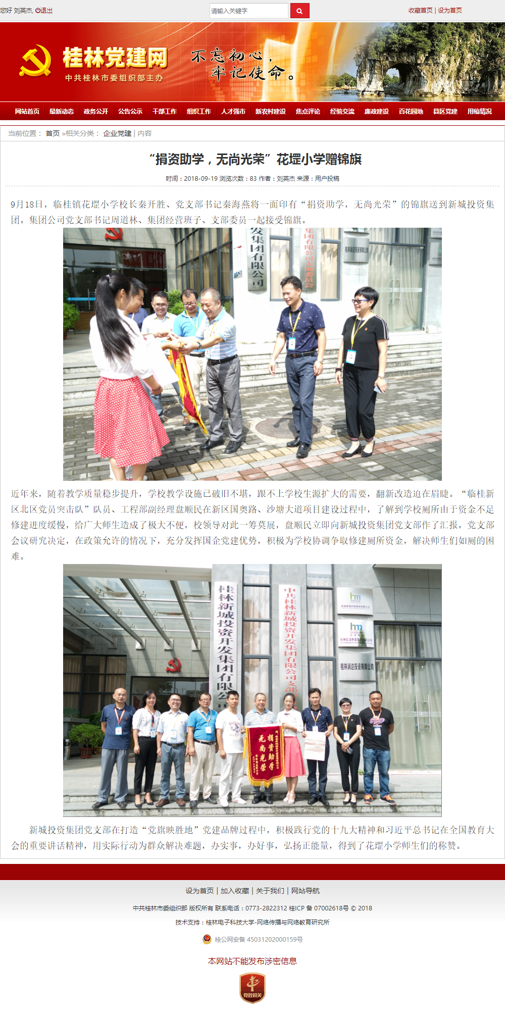 桂林黨建網(wǎng) “捐資助學(xué),無尚光榮”花堽小學(xué)贈錦旗