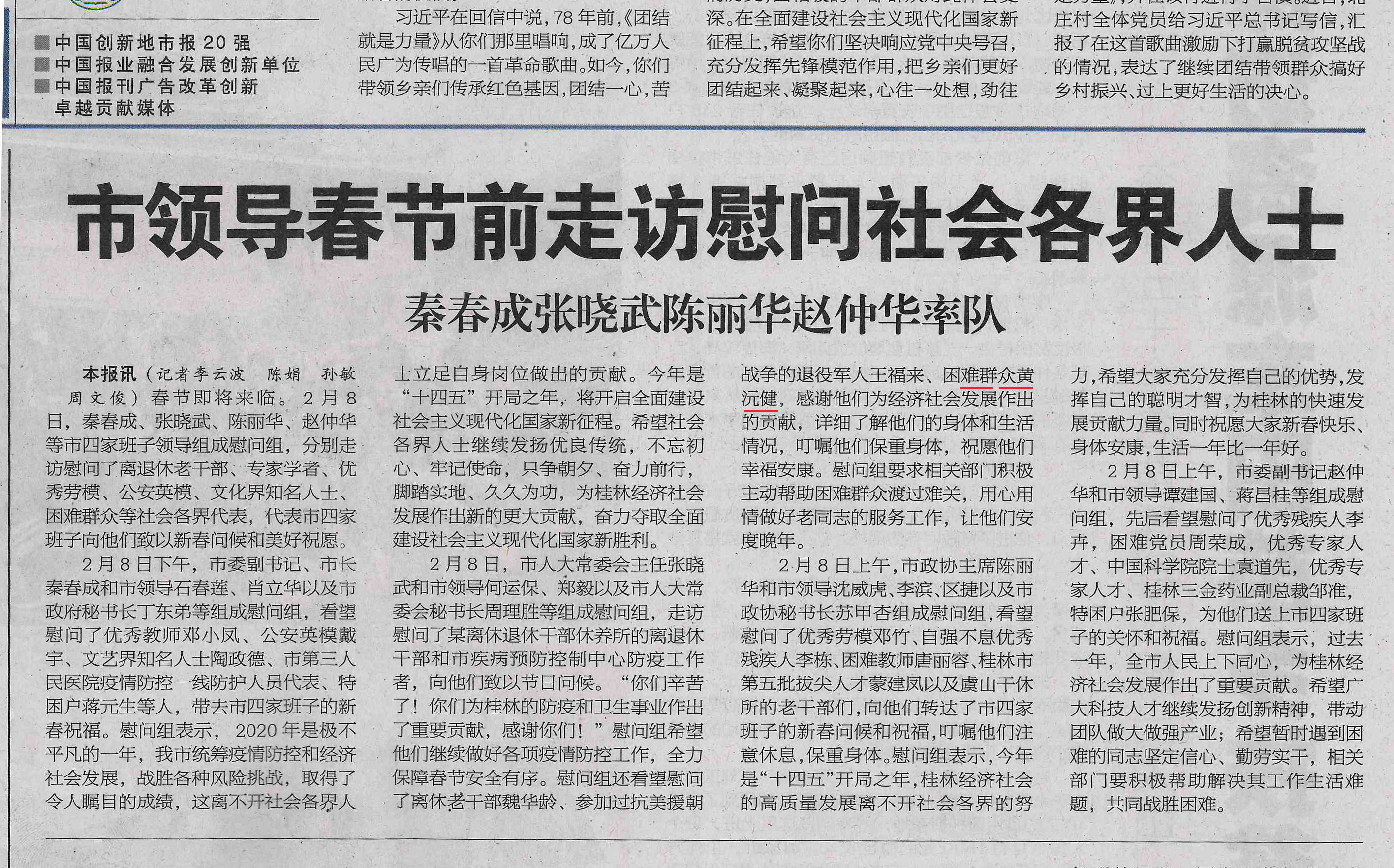 2月8日,市人大常委會主任張曉武和市領(lǐng)導(dǎo)何運保、鄭毅以及市人大常委會秘書長周理勝等組成慰問組,走訪慰問了桂林新城投資集團困難職工黃沅健。