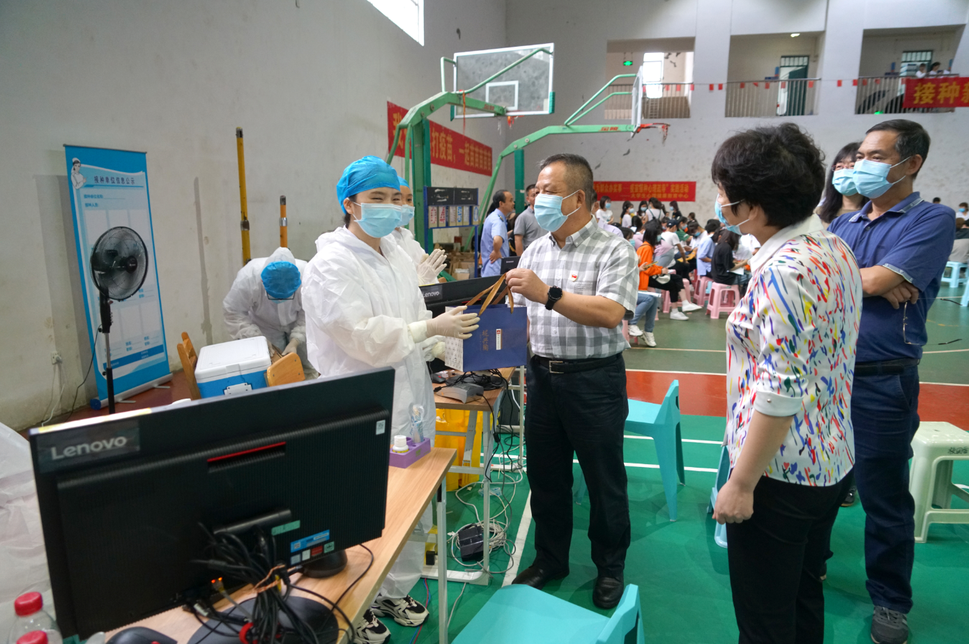 周道林一行在疫苗接種點(diǎn)查看接種情況、在留觀區(qū)詢問完成接種師生的觀察情況,并慰問了各服務(wù)點(diǎn)的醫(yī)護(hù)人員,代表新城投資集團(tuán)和漓江學(xué)院送上護(hù)士節(jié)的慰問品和祝福。