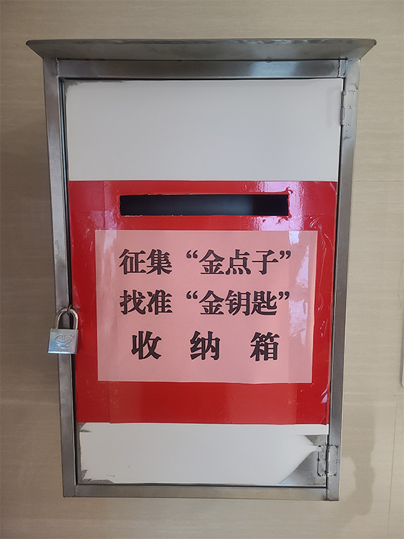 在公司15樓設(shè)置征集“金點子”找準(zhǔn)“金鑰匙”收納箱,直接由總經(jīng)理開取收納箱??偨?jīng)理將根據(jù)方案的可行性安排時間與提出方案的個人及團隊見面,聽取方案介紹,探討落實對策。