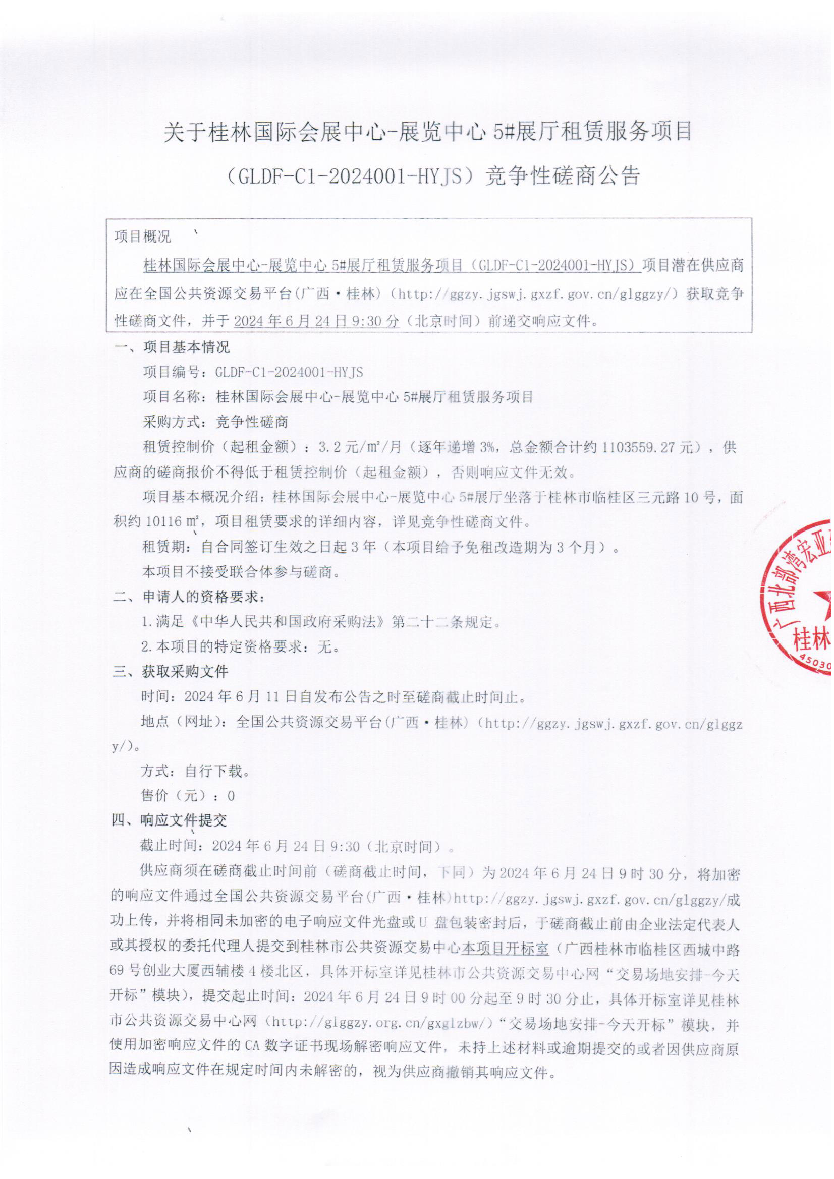 關(guān)于桂林國際會(huì)展中心-展覽中心5#展廳租賃服務(wù)項(xiàng)目(GLDF-C1-2024001-HYJS)競爭性磋商公告
