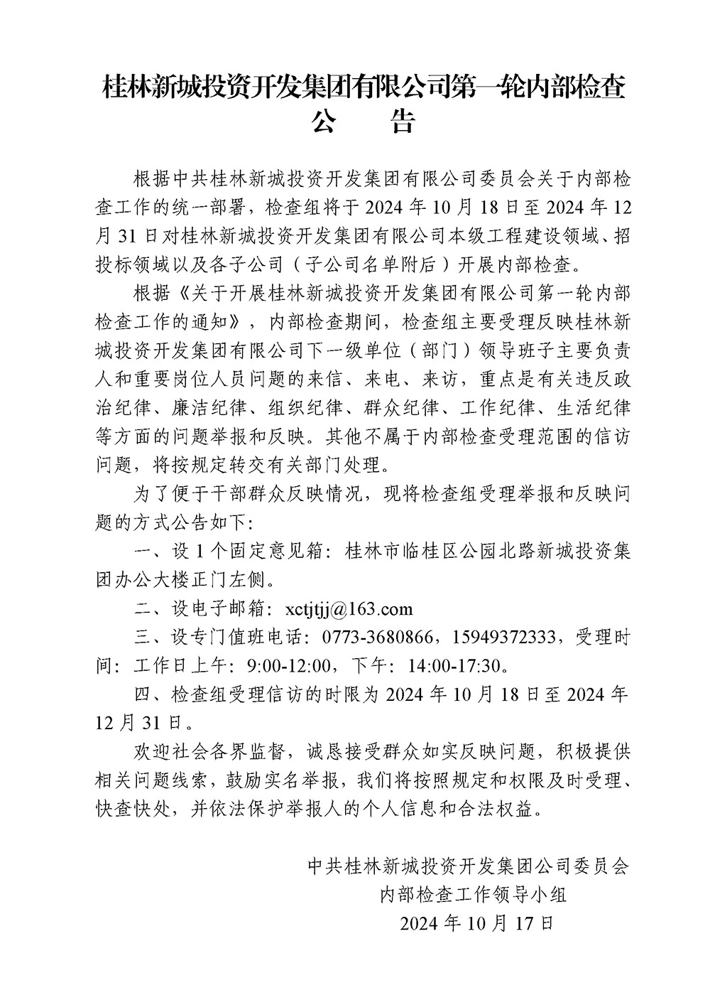 桂林新城投資開發(fā)集團有限公司第一輪內(nèi)部檢查公告