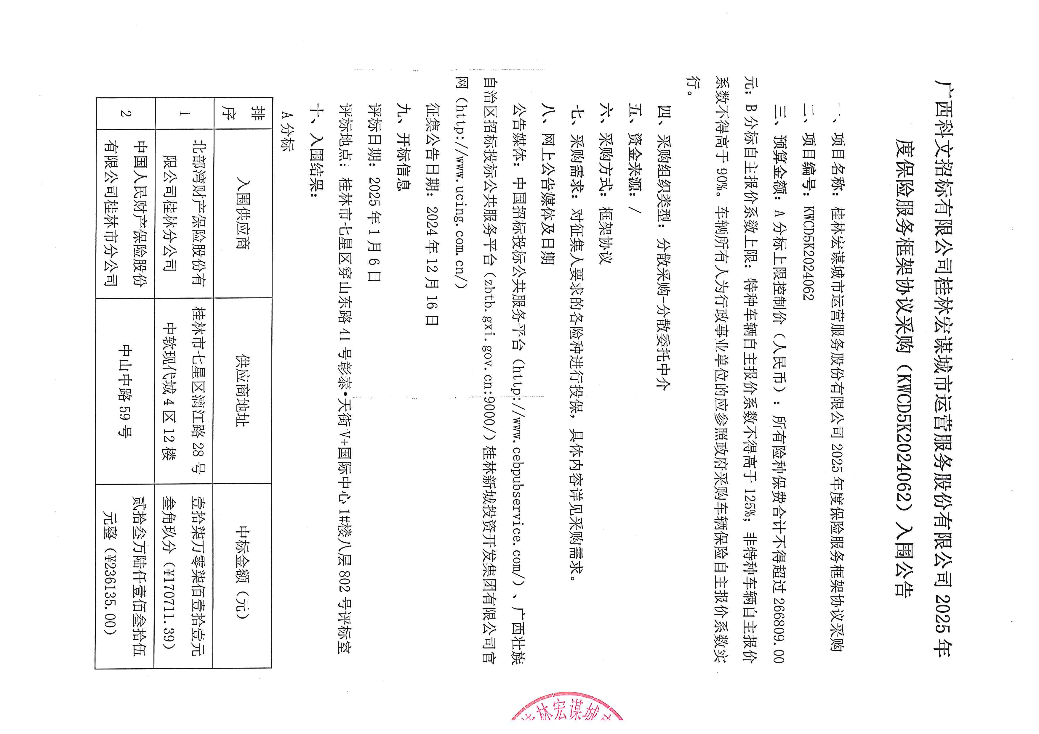 桂林宏謀城市運(yùn)營(yíng)服務(wù)股份有限公司2025年度保險(xiǎn)服務(wù)框架協(xié)議采購(gòu) (KWCD5K2024062)入圍公告
