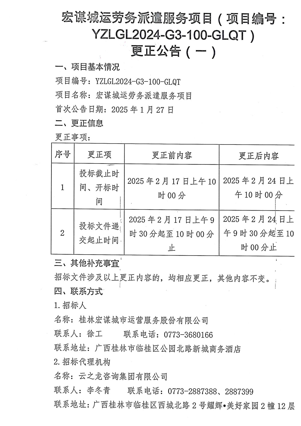 宏謀城運勞務(wù)派遣服務(wù)項目(項目編號:YZLGL2024-G3-100-GLQT)更正公告(一)