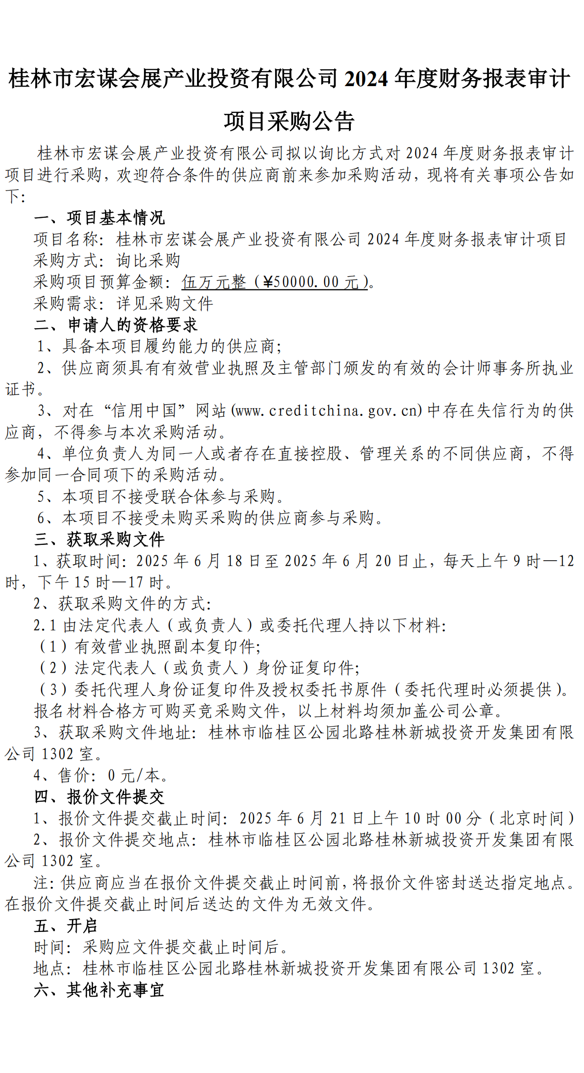 桂林市宏謀會展產(chǎn)業(yè)投資有限公司2024年度財務(wù)報表審計項目采購公告