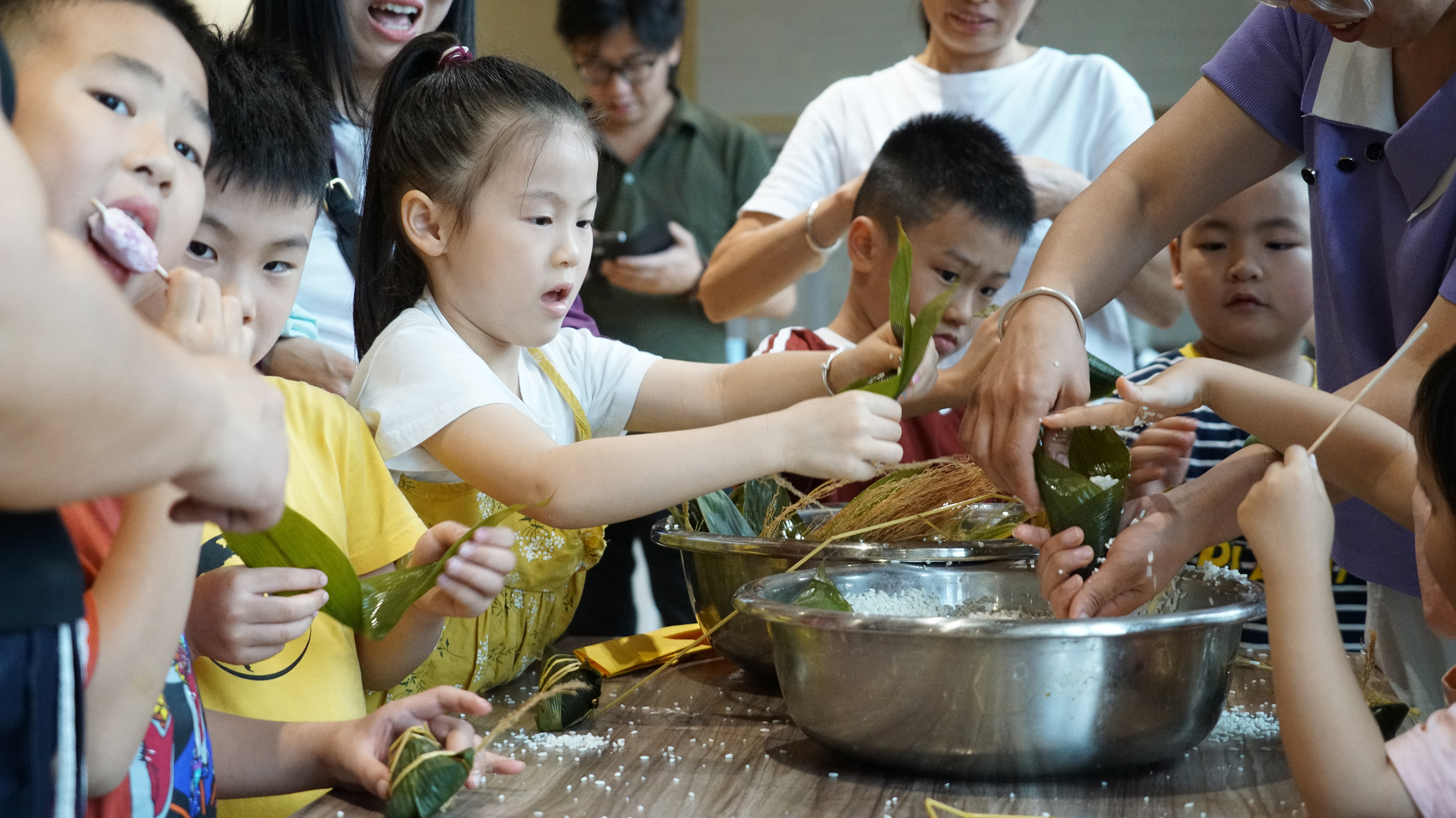 游戲環(huán)節(jié)結(jié)束后,大家開始包粽子、做香囊,孩子們圍著長(zhǎng)桌,小手笨拙又興奮地學(xué)著大人的模樣包粽子、做香囊,翠綠寬大的粽葉在他們手中顯得有些調(diào)皮,不是卷不成錐形,就是裹不緊邊角。另一邊的角落,則是五彩斑斕的香囊世界,孩子們圍坐在一起,桌上鋪滿了色彩鮮艷的綢布、五彩絲線、亮晶晶的小珠子,還有散發(fā)著濃郁草藥香氣的艾草和菖蒲碎。他們用小手仔細(xì)地挑選著心儀的布料,小心翼翼地裁剪成小小的口袋形狀。穿針引線對(duì)他們來說是個(gè)不小的挑戰(zhàn),小眉頭微微蹙起,線頭有時(shí)會(huì)調(diào)皮地打結(jié),但他們依然樂此不疲。通過包粽子、做香囊使孩子們深入了解中國各民族在端午節(jié)的悠久歷史和豐富的非遺傳承文化,感受到傳統(tǒng)文化的獨(dú)特魅力。